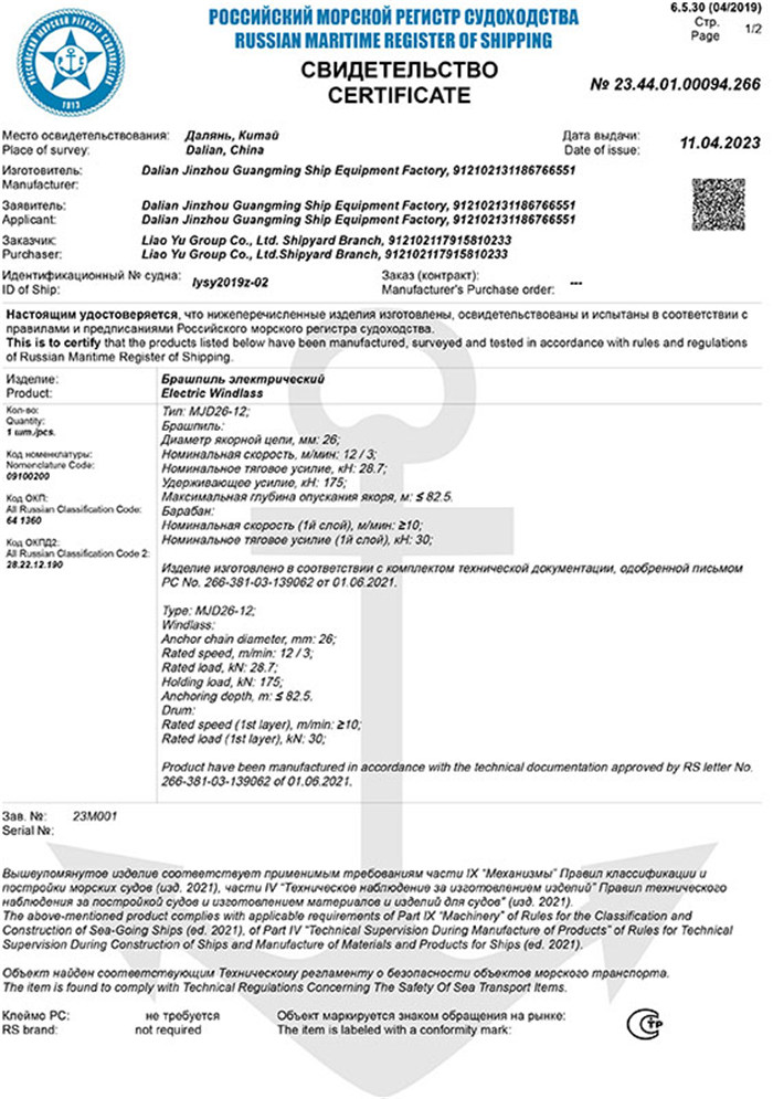 RS船用產品證書(吊機)